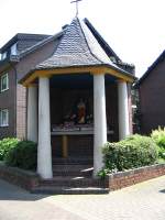 zur Geschichte - Auf der Ecke Blumestr Dülsweg liegt ei Kapellchen mit einer Herz Jesu Statue, im Volsmund "Friende Kapellchen" genannt. ES wurde 1928 mit Spenden der Nachbarschft der Gasse auf einem von dr Familie Pescher ( vormals Frienen) zur Verfügung gestellten Grundstück erbaut als Segensaltar für die Herz-Jesu Prozesson, die es von 1911 bis in die 1960er Jahre gab.