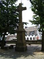 Denkmalliste MG - Das Wegekreuz wurde an die der Stadt zugewandte Südseite des Neuen Wasserturms versetzt. Es handelt sich um ein ca. 340 cm großes Wegekreuz aus Liedberger Sandstein, das auf einer jüngeren Sockelplatte aus Basaltlava steht. Auf einer mit Karniesgesims endenden Basis steht ein hochrechteckiger Sockel, auf dessen Frontseite die folgende Inschrift in eingetieften Kapitalen zu lesen ist: ANNO MDCCXI DEN 11 JVNIVS HAT GERHARD SEGERS BVRGERM(meiste)R VND AGNES CLOTH EHELEVTH ZV EHREN GOTTES AVFRICHTEN LASSEN I. M. I. Darunter befinden sich zwei Wappenschilde mit den Initialien GS und AS. Die Seitenflächen des Sockels zeigen je eine erhaben aufgelegte Steinfläche in Form eines Kissens mit abgerundeten Ecken. Der Sockel schließt mit einer starken Profilierung aus kräftigem Rundwulst und beidseitig begleitenden Leisten ab. Sie leiten über ein Karniesprofil zur Basis des wuchtigen Schaftes eines lateinischen Kreuzes mit aufgelegtem Corpus als Halbrelief über. Die Kreuzbalken enden mit aufgelegten Rundwülsten. Die Basis des Kreuzschaftes zeigt eine niedrige Nische in Form einer Konche, vor der eine halbrunde Abstellfläche für die bei Prozessionen mitgeführte Monstranz auskragt. Ein kleines schmiedeeisernes Geländer stellt eine jüngere Ergänzung dar. Das Objekt ist bedeutend für die Geschichte des Menschenu und für Städte und Siedlungen. An seiner Erhaltung und Nutzung besteht ein öffentliches Interesse aus wissenschaftlichen, insbesondere künstlerischen, ortsgeschichtlichen und volkskundlichen Gründen.